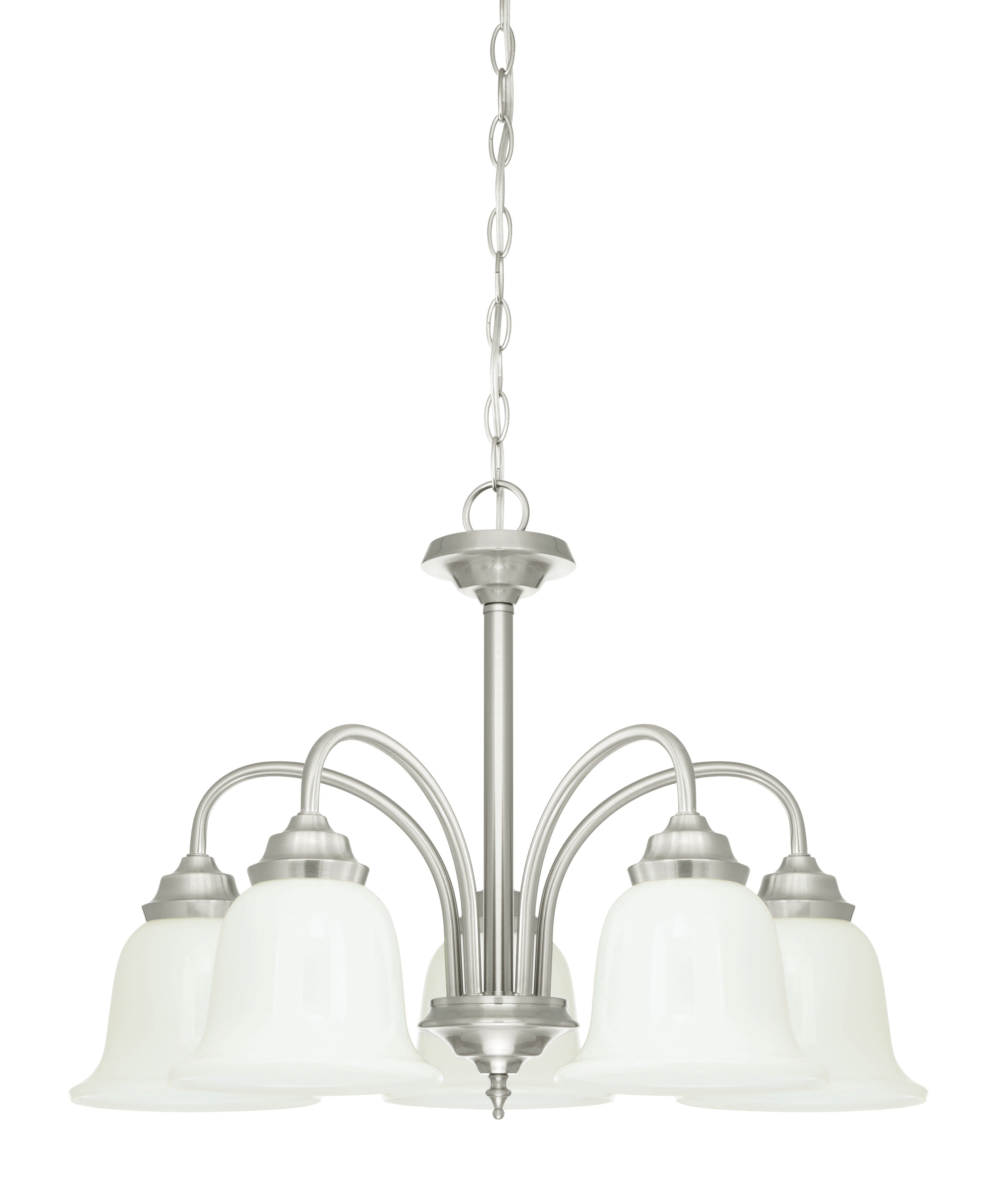 - With its simplistic, traditional design, the Harwell five-light chandelier is a smart choice for your task and ambient lighting needs. Enhancing this casual style fixture is an elegant brushed nickel finish and white opal bell shaped glass that is complementary to any decor. Create a cohesive look throughout your home with coordinating fixtures from this collection.